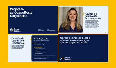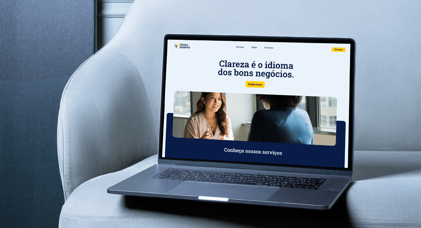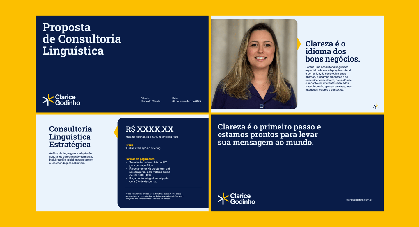 Clarice Godinho é uma consultoria linguística especializada em adaptação cultural e comunicação estratégica entre idiomas, ajudando empresas a se posicionarem com clareza em contextos globais. O projeto surgiu para fortalecer essa presença, traduzindo sua expertise em uma identidade visual mais profissional, consistente e alinhada ao seu posicionamento.