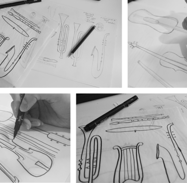 The illustrations were inspired by the elegant shapes of orchestra instruments, representing the four main sections: strings, percussion, woodwinds, and brass. Each instrument contributes to the final harmony, just as every element in coffee preparation is essential for a perfect result.