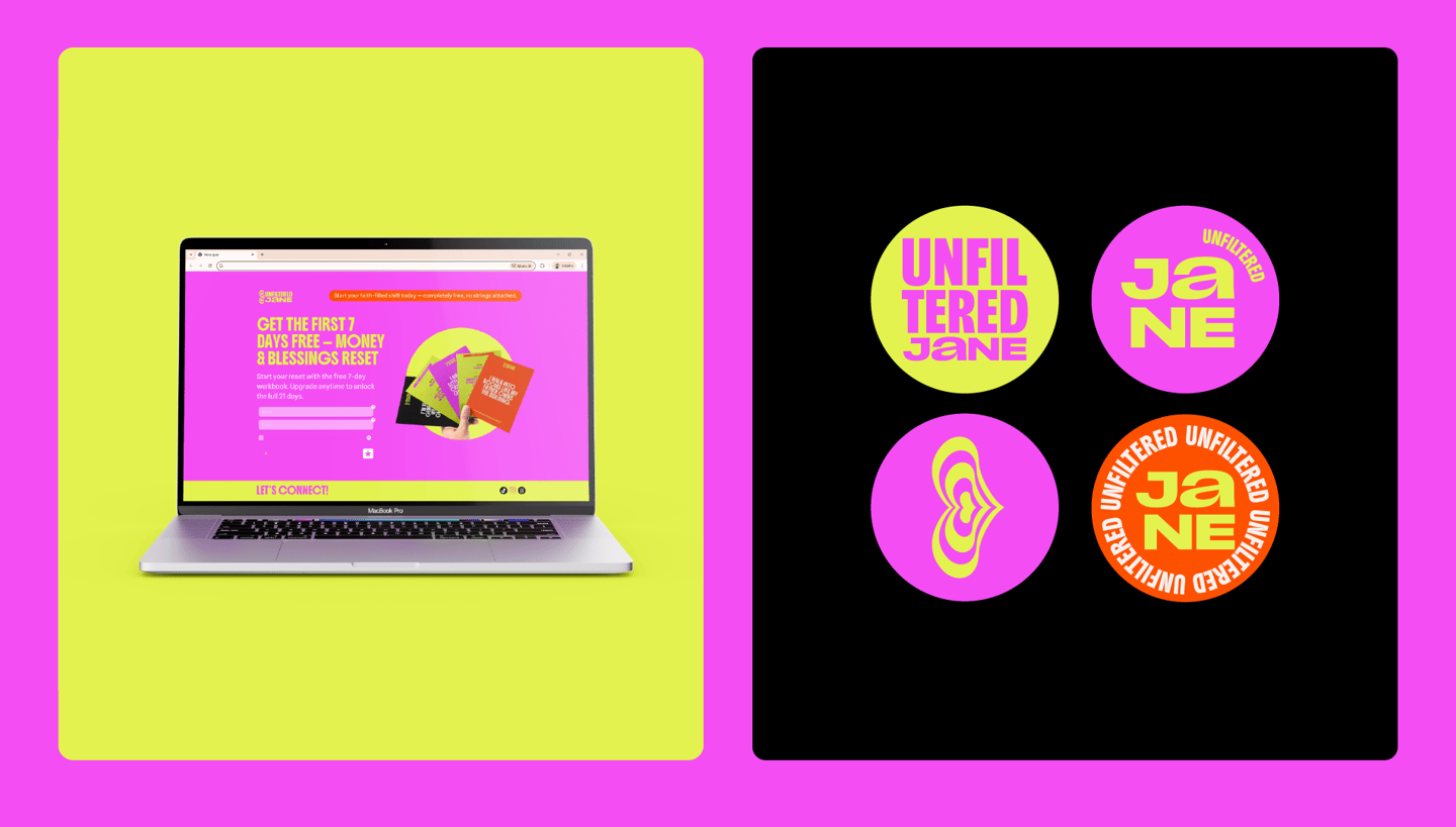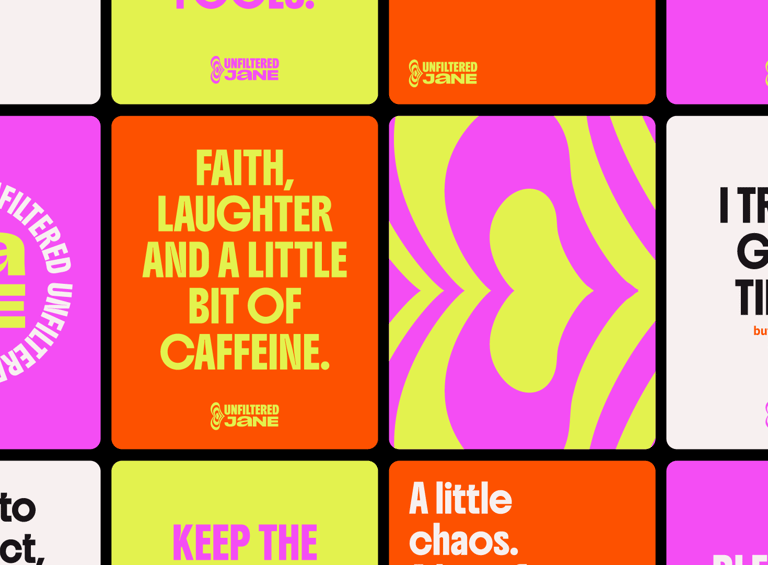 Um sistema visual vibrante e expressivo, que combina cores intensas, tipografia de personalidade marcante e um símbolo abstrato inspirado em voz e expansão. Essa abordagem permitiu construir uma identidade reconhecível e flexível, capaz de sustentar conteúdos dinâmicos, fortalecer a presença digital da Unfiltered Jane e criar conexão emocional com sua comunidade, mantendo a mensagem espiritual clara, humana e sem filtros.