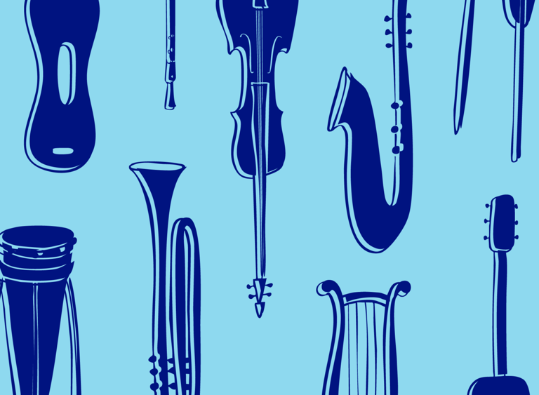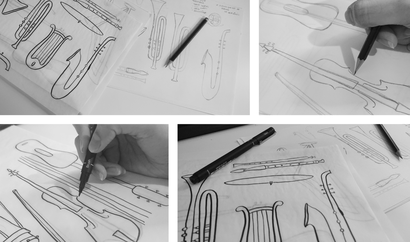As ilustrações foram inspiradas nas formas elegantes dos instrumentos de orquestra, representando as quatro principais seções: cordas, percussão, sopros e metais. Cada instrumento contribui para a harmonia final, assim como cada elemento na preparação do café é essencial para um resultado perfeito.